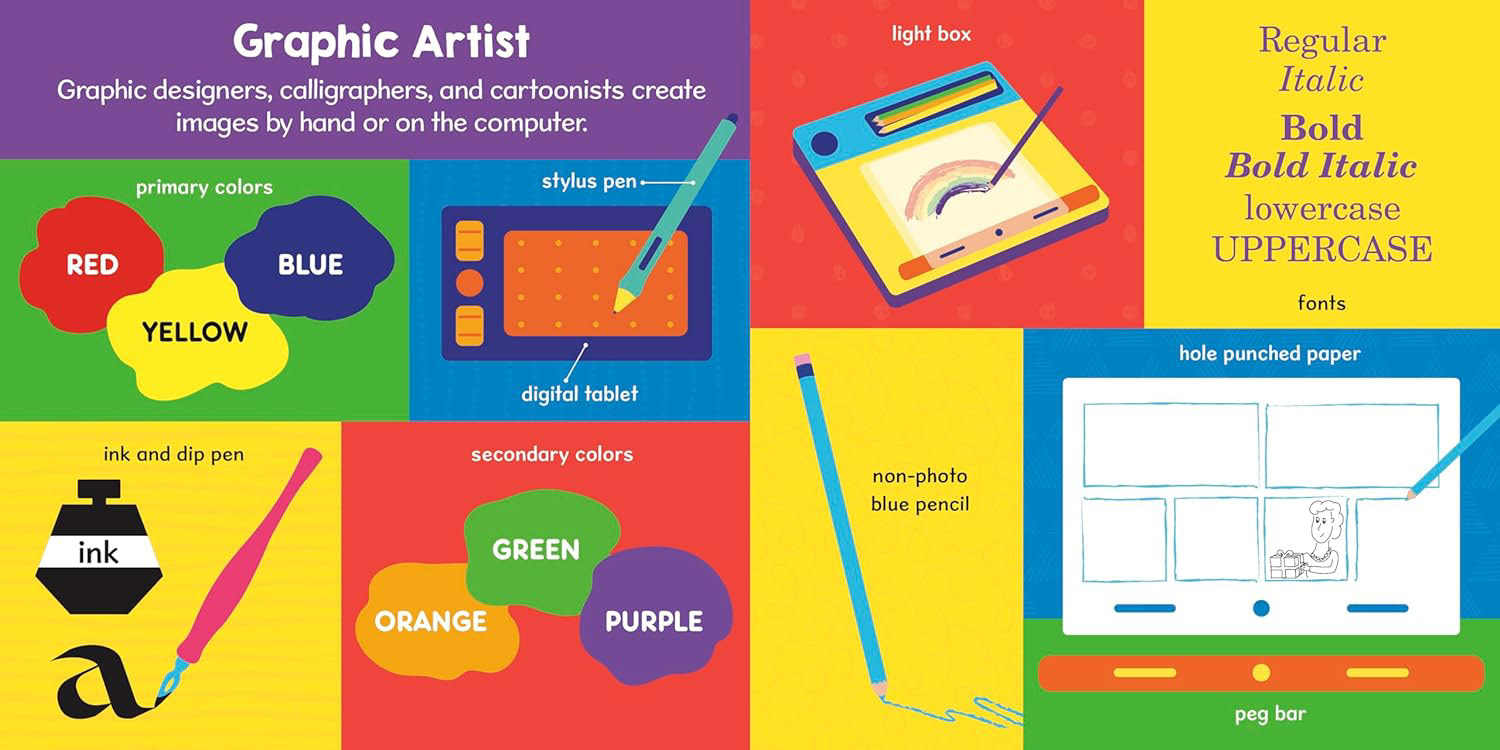 From color wheels to computers, each page in this unique first words book is filled with tools used by different artists!